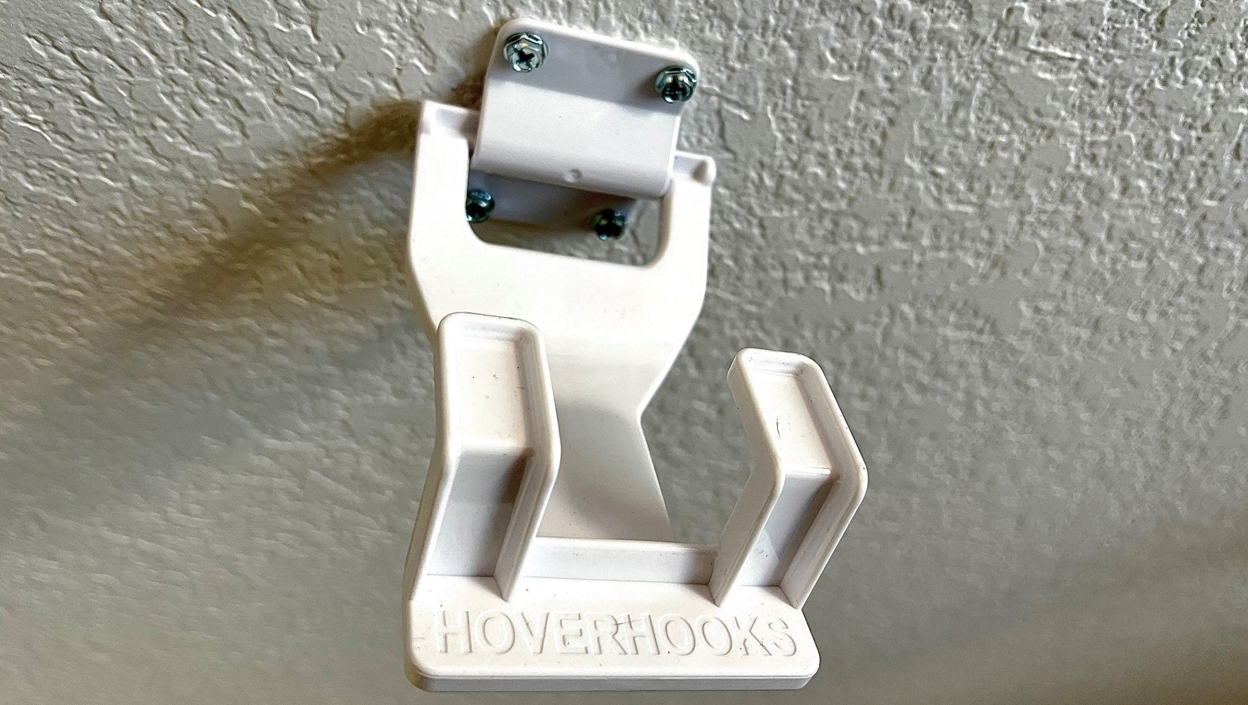 Each HoverHook is injection molded ABS pivotably captured by a ceiling mounted bracket. Hoverhooks are great for garages, storage rooms, workshops, closets and offices. HoverHooks attach directly to your drywall, so no need to locate studs. However, you can still attach to the studs if desired.