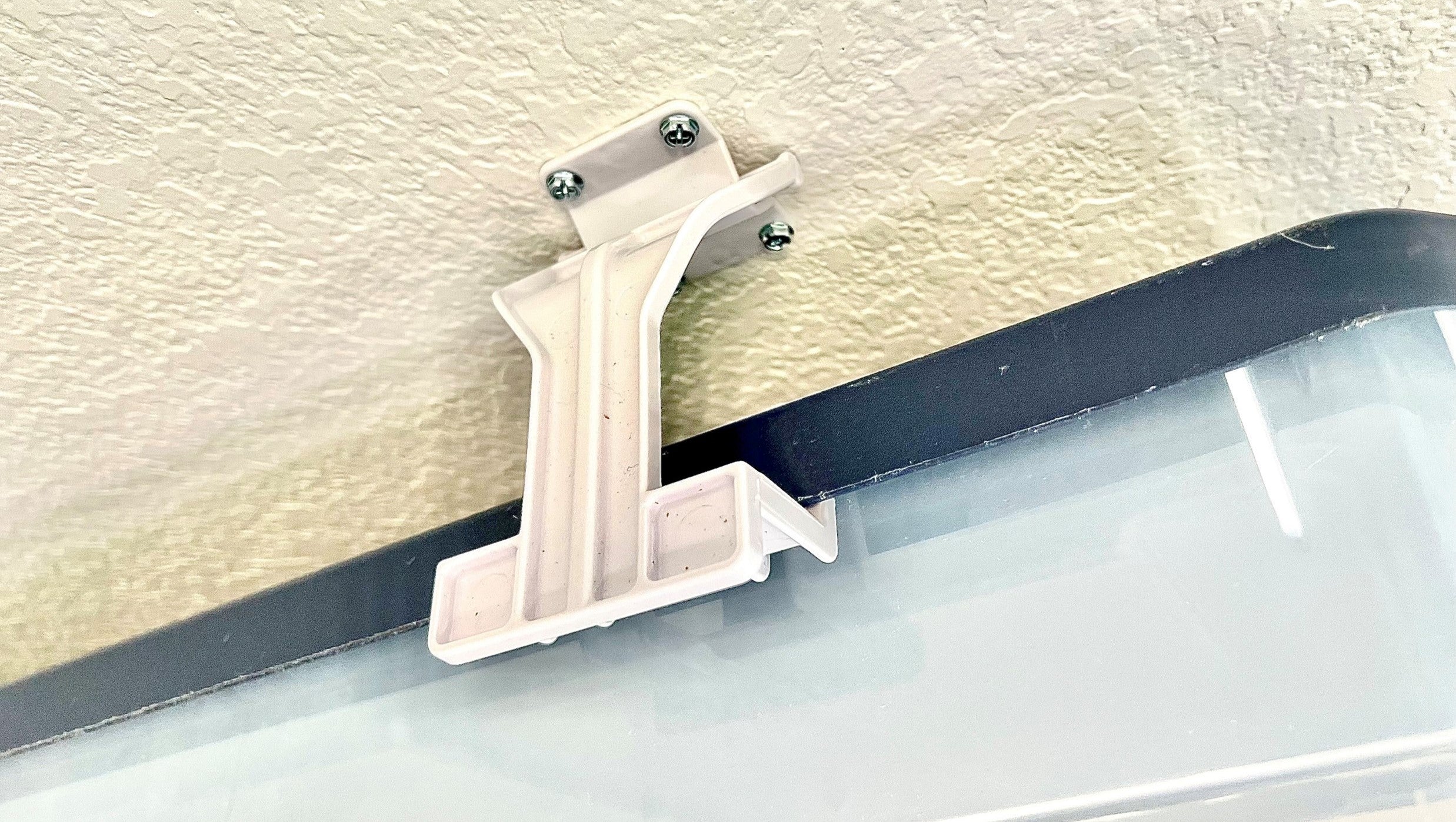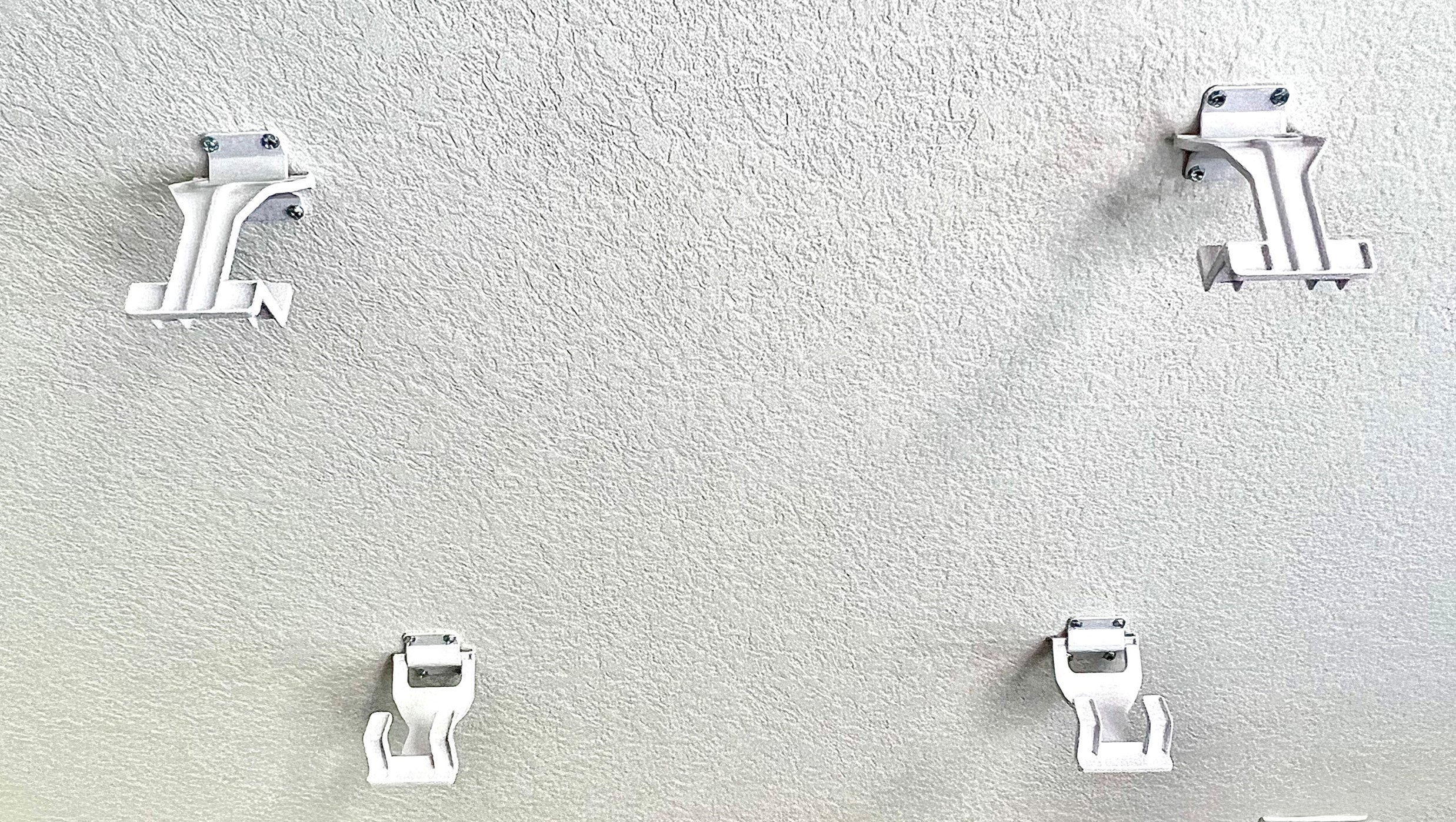 The hardest part of installing the HoverHooks are marking the holes on the ceiling that match the bin size. Therefore, we created the Installation Tool which makes it a breeze. The Installation Tool adjusts to any bin size and then temporarily attaches to the ceiling. This gives you plenty of time to mark the holes for each HoverHook bracket.