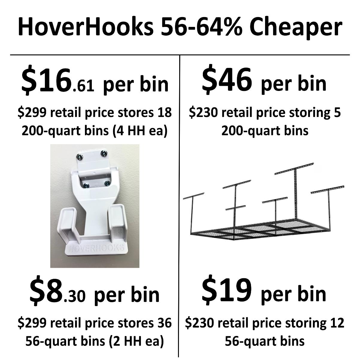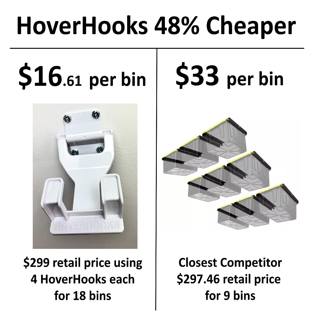 HoverHooks are 48% cheaper than our closest competitor. Using 4 HoverHooks it costs $16.61 to store a large bin from your ceiling. However, for smaller bins using just 2 HoverHooks, the cost per bin storage is $8.30. More importantly, HoverHooks can store ALL bin types and not just one specific type that the competitor requires.